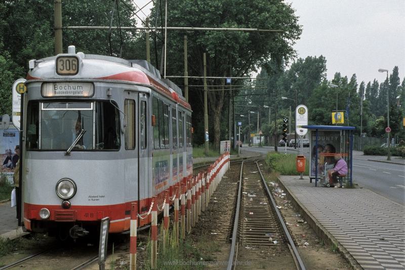 Das von Stefan Höltge aufgenommene Beitragsbild führt uns zurück an die Stadtgrenze zwischen Bochum und Herne. Noch wartet die Riemker Straße auf den Ausbau. Am 12. Juni 1995 wartet Triebwagen 41 auf Fahrgäste, die ihren Besuch im nahen Einkaufszentrum beendet haben.