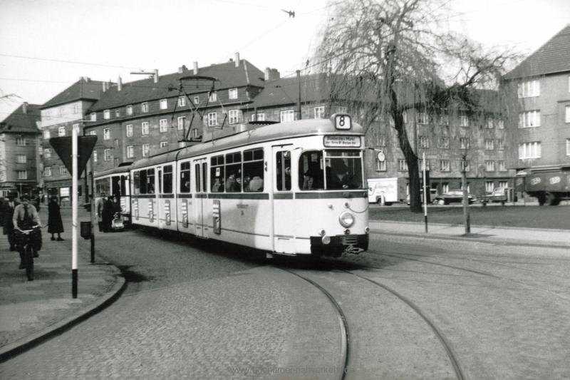 Vermutlich im Frühjahr 1958 entstand das Beitragsbild des Kapitels. Es zeigt den nagelneuen Triebwagen 264 auf der Linie 8. Bis zur Haltestelle „Röderschacht“ oder bis „Linden-Mitte“ führt er zur Verstärkung einen der fünf Beiwagen des „Verbandstyps“ mit. Das seltene Foto wurde im September 2023 über einen Postkartenhändler angeboten. Der Fotograf ist deshalb nicht mehr bekannt (Sammlung Ludwig Schönefeld).